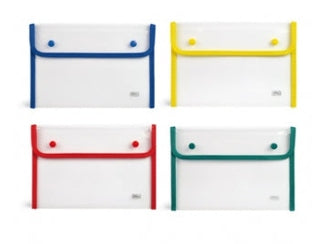 Busta in PP trasparente semirigida e cordonata, chiusura con bottoni a pressione e bordatura in tessuto colorato