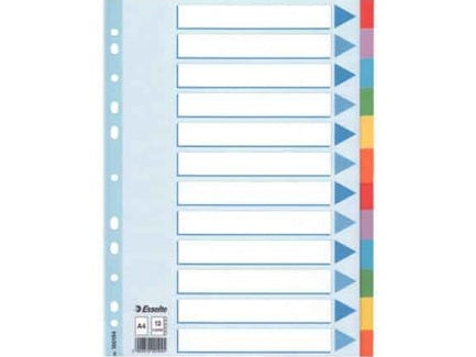 Divisori neutri in cartoncino plastificato formato A4. Pagina iniziale prestampata per indice frontale. Foratura universale