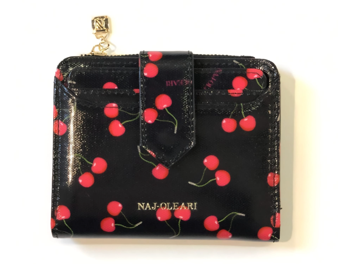 Portafoglio con ciliegie compatto. Chiusura con bottone e portacarte da estrarre. All'interno scompartimento per banconote, monete e portatessere.
