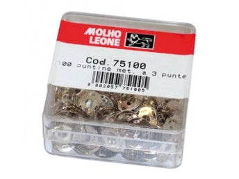 Puntine da disegno a tre punte temperate e nichelate che fissano con sicurezza, non si piegano e non arrugginiscono. Confezione da 100 pz.
