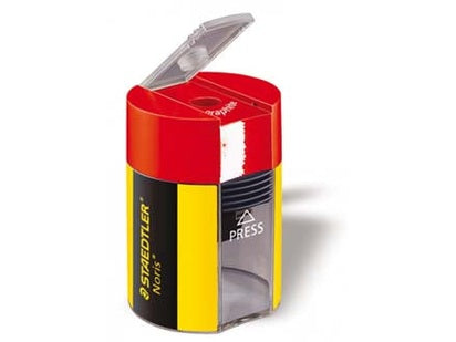 Temperamatite a 1 foro con contenitore per trucioli, per matite con fusto del diametro fini a 8 mm. Meccanisco in metallo con lama in acciaio inox