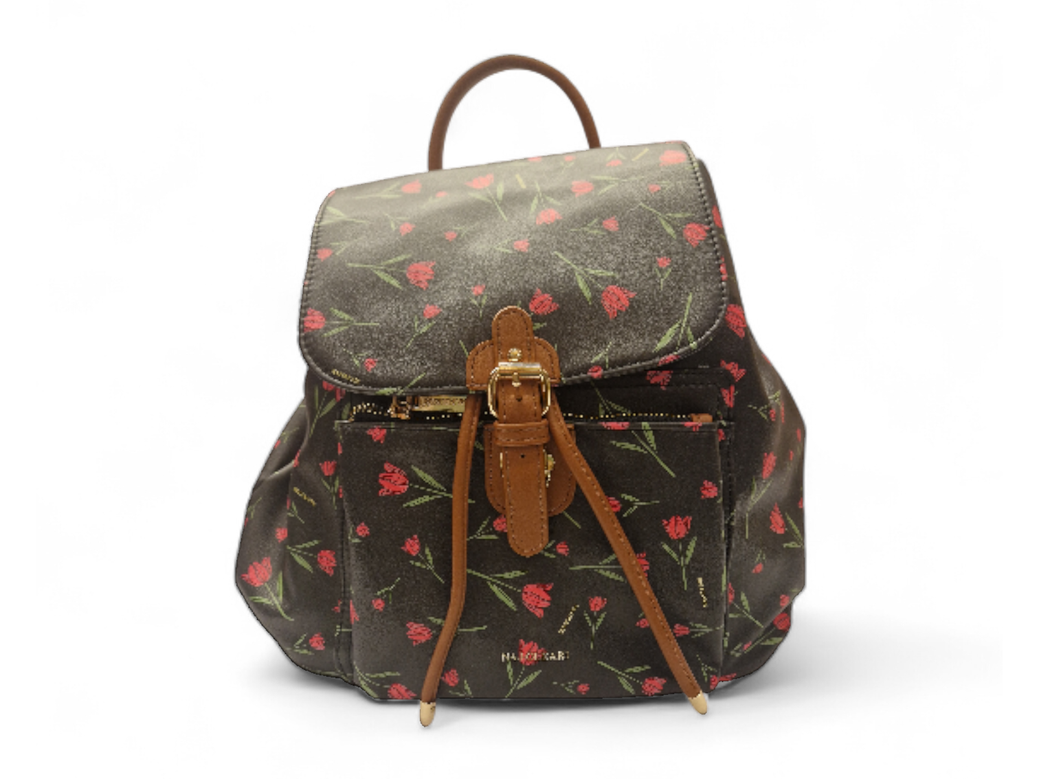 Zaino con chiusura a patta con bottone e coulisse. Tasca frontale con zip, spallacci in nastro regolabile. All'interno una tasca con zip e due taschine aperte.